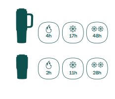 1.1L: hot for up to 4 hours, cold for up to 17 hours, with ice for up to 48 hours.